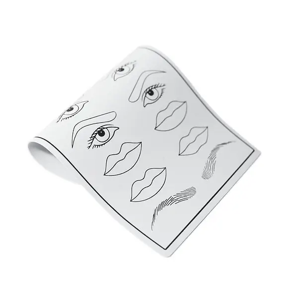 На поверхні пропонованої шкіри, виготовленої з силікону, який дуже схожий на людську шкіру, знаходиться кілька шаблонів очей, губ і брів. Вони служать для практичного тренування мікроблейдингу та перманентного макіяжу. Весь аркуш білий, що полегшує роботу з кольоровими пігментами, а контури губ, очей і брів намальовані контрастним кольором, що значно спрощує роботу. Аркуші відносно невеликі і їх можна взяти з собою додому або у подорож, де ви хочете покращити свої практичні навички.